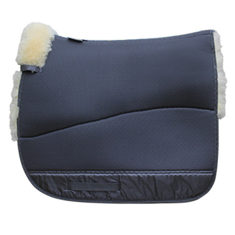 AirTec Schabracke Lammfell Die AirTec Linie ist einmalig in seiner luftzirkulierenden und atmungskativen Funktion. Ein dauerelastischer, hochwertiger Polymerkunststoff ist von beiden Seiten mit speziell entwickeltem Funktionsgewebe in dreidimensionaler, elastischer Struktur unterlegt. Die unterste Schicht besteht aus Lammfell mit einer fein perforierten Lederschicht. Während der natürlichen Reitbewegung zusammengedrückt gewinnt die Sattelunterlage bei der anschließenden Entlastung ihr ursprüngliches Volumen zurück. Durch diesen Pumpeffekt ensteht eine Ventilation und sogt für optimalen Luft- und Feuchtigkeitsaustausch.