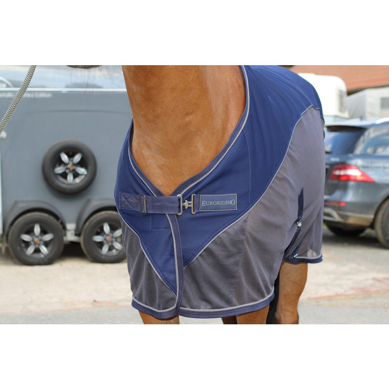 Die Decke hat einen Verschluss im Brustbereich, welcher zusätzlich mit einem starken Klett gesichert ist. Euroriding-Logo auf dem Brustverschluss.