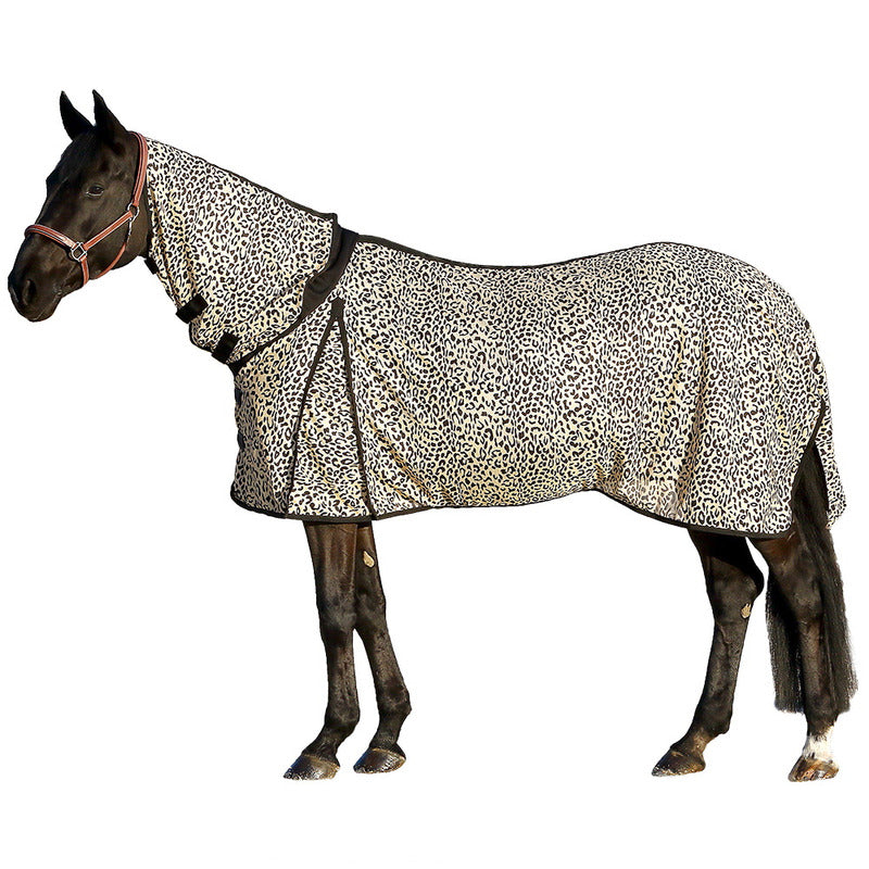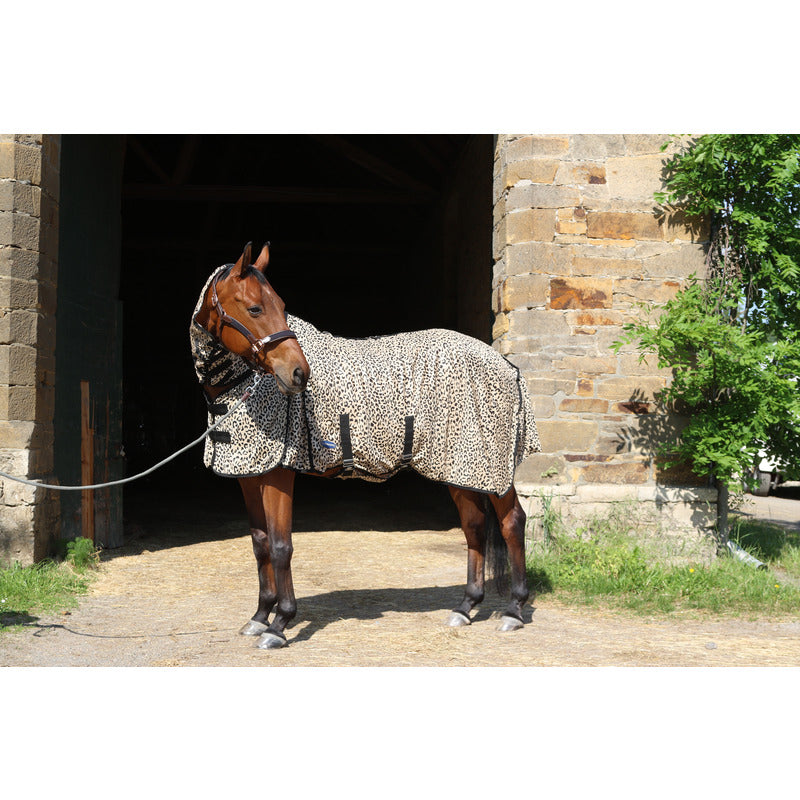 Die Fliegendecke bietet viel Komfort im angesagten animal Print. Sehr großer Schweiflatz für optimalen Schutz. Das Halsteil ist mit den Klettverschlüssen schnell anzupassen und ist mit dem Rest der Decke über einen breiten, elastischen Stoffeinsatz verbunden. So hat das Pferd auch bei gesenktem Kopf keinen Zug auf dem Widerrist und es kommt zu keinen "klaffenden" Lücken zwischen Halsteil und Rückenpartie. Die Decke verfügt über einen Bauchlatz mit zwei elastischen Verschlüssen. Es gibt einen Schweifriemen, für Beinschnüre sind ebenfalls Ösen vorgesehen. Das Gewebe ist angenehm leicht.