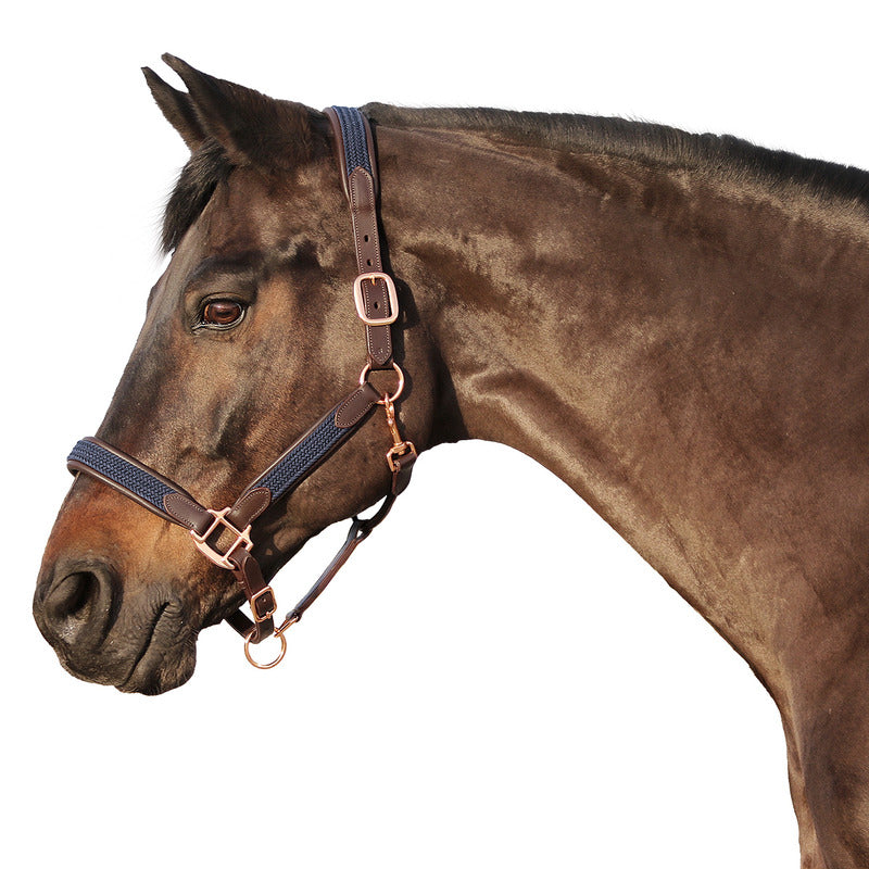 Lederhalfter mit geflochtenen blauen Nylon-Applikationen auf dem Nasenriemen, den Backen und dem Genickstück.