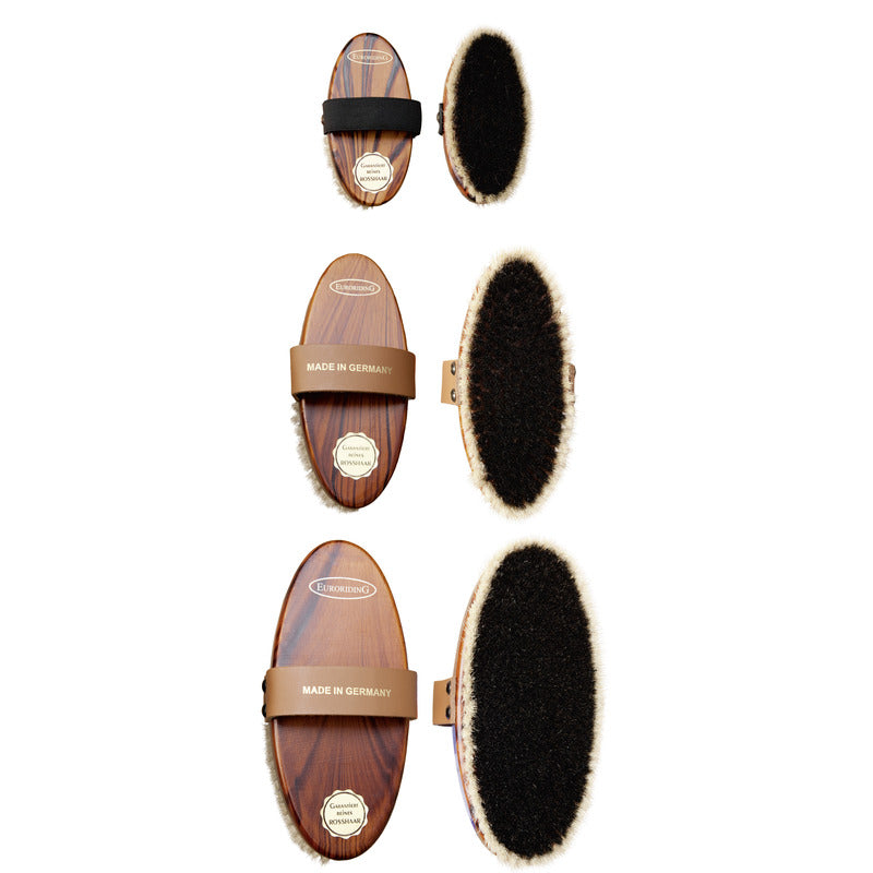 Die hochwertigen Kardätschen aus Rosshaarmischung polieren das Fell auf Hochglanz. Mit lackiertem Holzrücken aus Buche und ergonomischer Lederschlaufe.