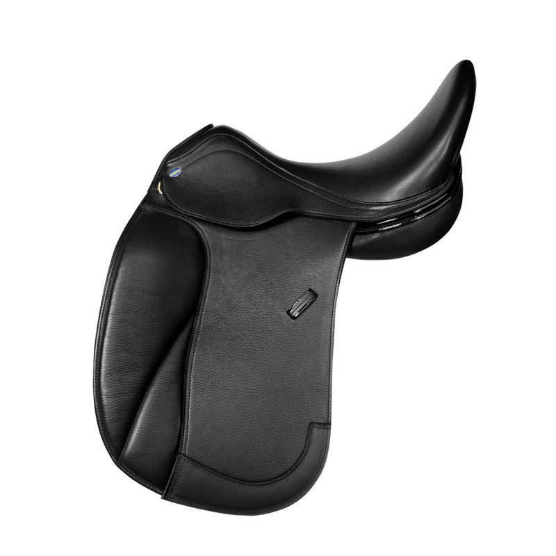 Der Sattel Mondo Stardust basiert im Standard auf dem Modell Afrodite mit tiefem Dressursitz und hohen Pauschen, die hier als Klettpauschen vorgesehen sind. Alternativ ist er mit kleinen Pauschen bestellbar. Er wird sowohl mit dem Carbon-Baum als auch mit dem GRP-Baum angeboten. Das Kopfeisen ist das neue U-Kopfeisen der Firma Kentaur, was im Schulterbereich eine bessere Bewegungsmöglichkeit für das Pferd bietet. Der Sattel ist kalt verstellbar. Der Sitz hat die neue Venuslösung mit einer Aussparung im vorderen Sitzbereich, die der ReiterIn ein extra bequemes Sitzgefühl gibt. Er ist mit Kalbsleder doubliert und hat die feinen Glitzerapplikationen am Efter sowie Lack am Vorstoß und den Steigriemenschlaufen.