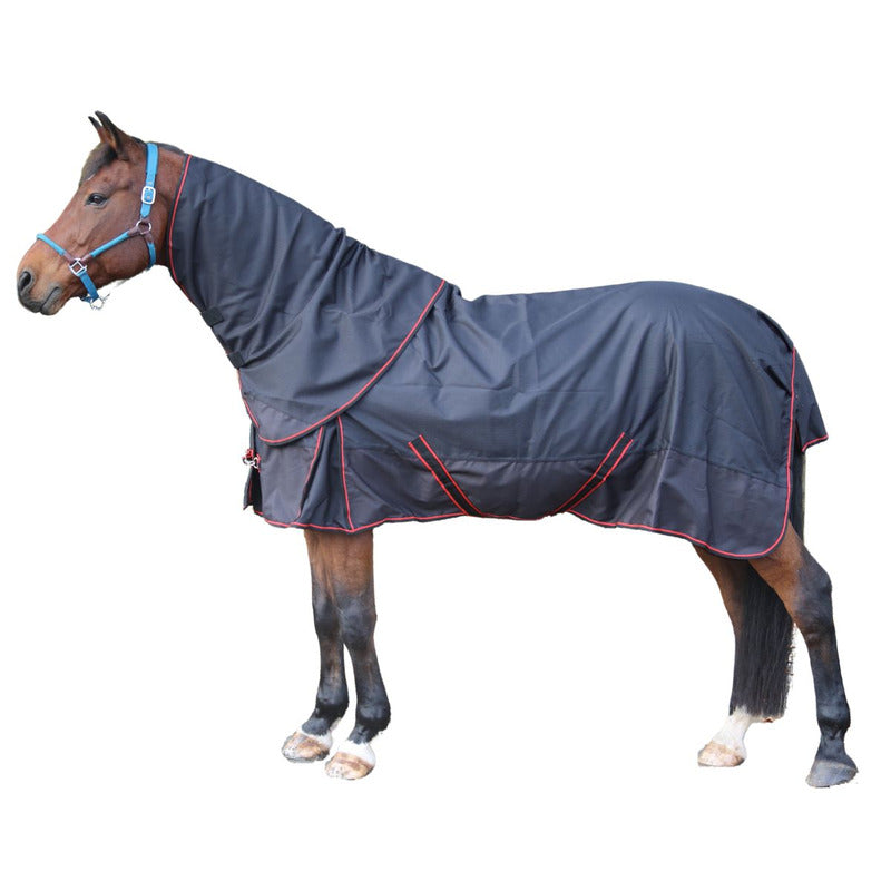 Schlaufen zum Anbringen einer Schweifkordel vorhanden. Neopren am Widerrist verhindert, dass Regenwasser in die Decke gezogen wird (z. B. im Vergleich zu Fell)