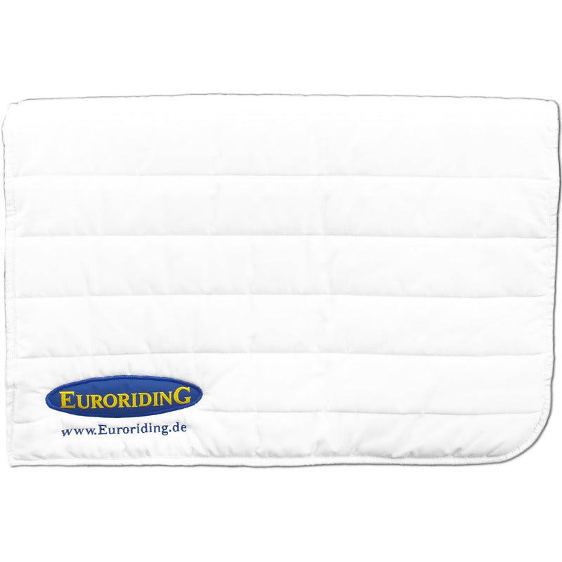 Weisses Sattelpad beidseitig mit blau-gelbem Euroriding-Logo bestickt.